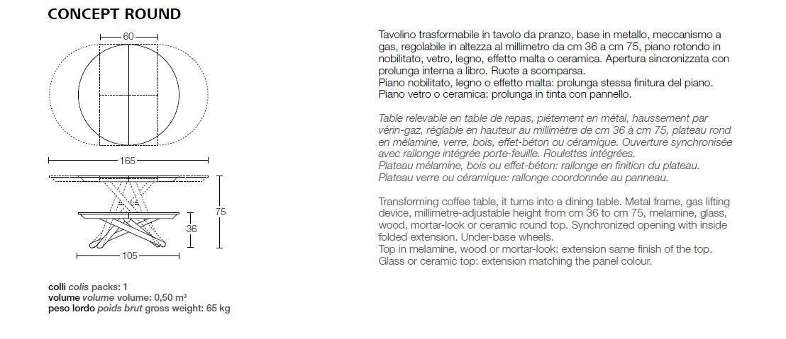 Metal frame, gas lifting device, millimetre-adjustable height from 36 cm to 75 cm, melamine, wood, glass, mortar-look and ceramic round top, synchronised opening with inside folded extension. Under-base wheels.