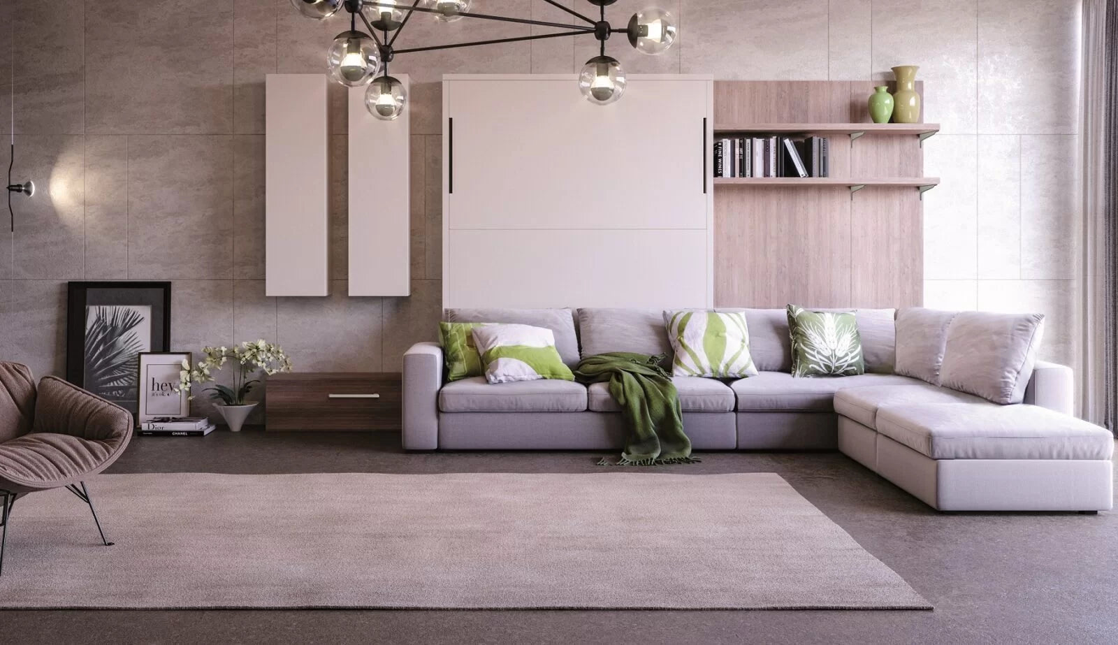 An extensive modular closet and shelving system integrates seamlessly with the Workstation wall bed, allowing you to create fully customised storage and living solutions.