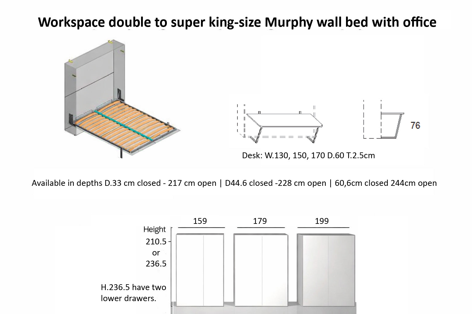 Available in 140cm (Double), 160cm (King) and 180cm (Super King), Workstation can be ordered in three depths, D.35, D.44.6 or 60.6 cm, and offers exceptional stability and durability, standing apart from typical wall beds on the market. Its premium mechanism is designed for daily use, delivering long-term reliability with minimal effort.